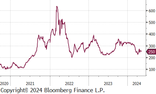 The Aussie coking coal 2nd month future fell by $3 or -1.2% to $250, however the five-week price change is still up by $24 or 10.6% to $250.
