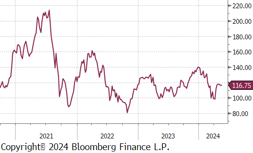 The 2nd month iron ore future edged down by $0.80 or -0.7% to $116.75, however, similarly, the five-week price change continues to be up, by $19.75 or 20.4%.