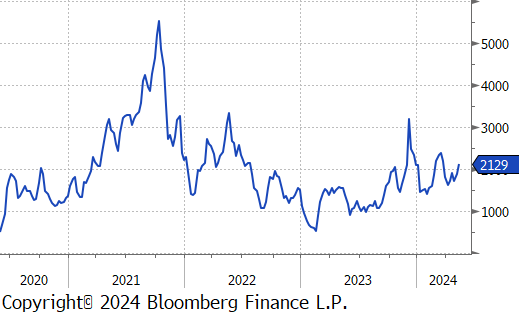 The Baltic Dry Index rose by $355 or 20.0% to $2,129, reaching its highest level in seven-weeks.