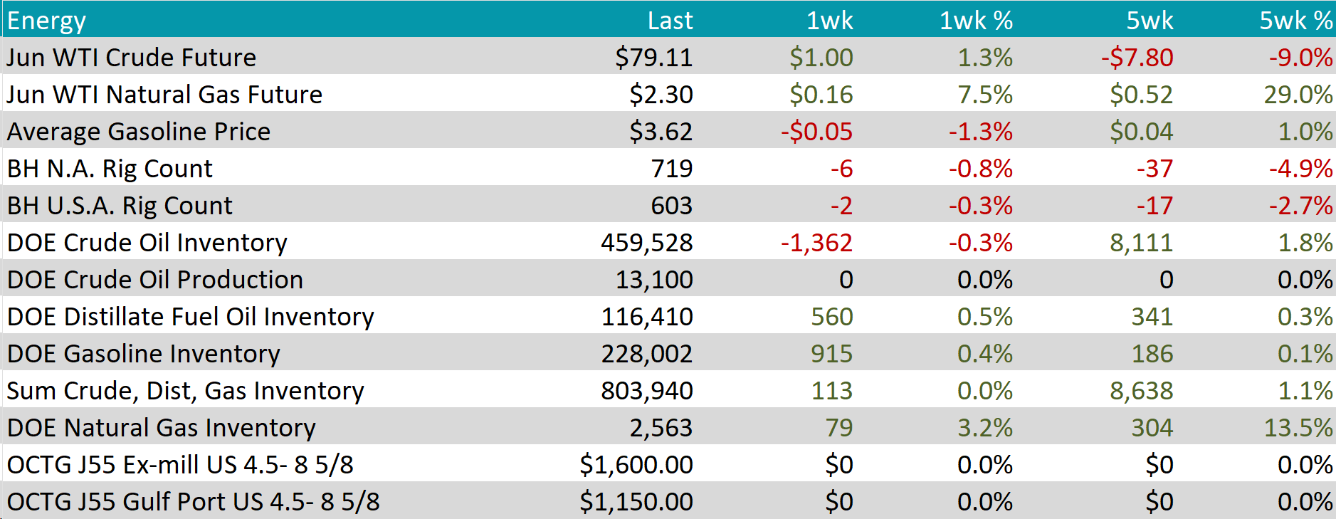 The Baker Hughes North American rig count reduced by 6 rigs, bringing the total count to 719 rigs. The US rig count also declined, reducing by 2 rigs, bringing the total count to 603 rigs, continuing to hover just above the 600 level.