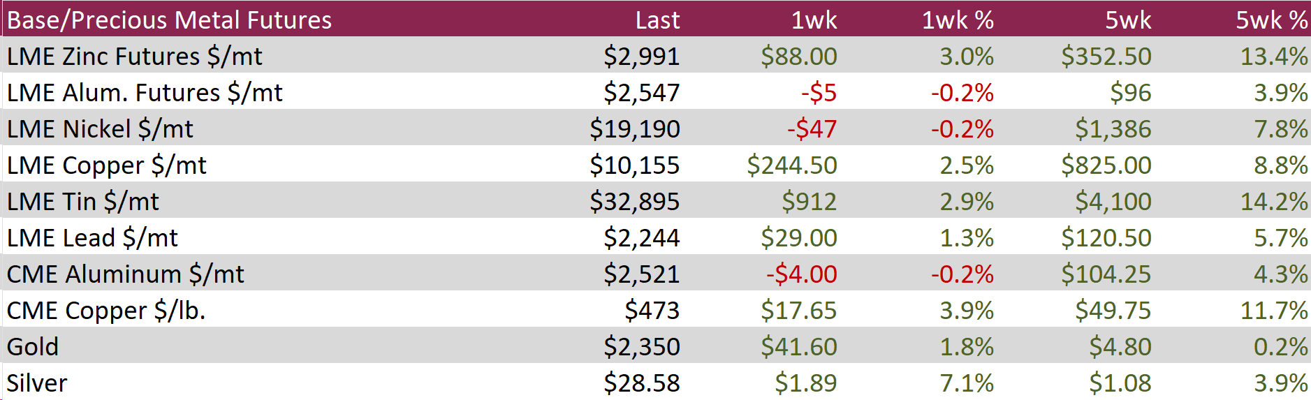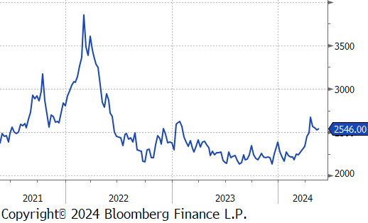 Aluminum futures fell by $5 or -0.2% to $2,547, down from a near two-year high, as concerns over supply shortages eased. This change followed a significant increase in London Metal Exchange (LME) stocks, which saw nearly 140,000 tonnes of sanctioned Russian aluminum re-warranted, allowing traders to engage in profitable rent deals in approved warehouses. Despite this boost in available stocks, the market’s fundamentals remained largely unchanged because the re-warranting of metals by commodity giants was anticipated. However, new sanctions continue to restrict the sale of aluminum to US and UK markets, maintaining some supply limitations. Additionally, the Aluminum Corp of China highlighted ongoing uncertainties in bauxite supply, largely due to China’s reliance on Guinea, which has faced disruptions after an explosion at a critical fuel depot. In Yunnan, China’s fourth-largest aluminum-producing region, production curbs persisted due to the annual dry season, further impacting supply dynamics.
