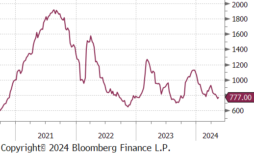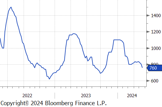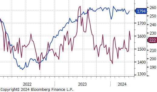 Mill production continued to inch back up, with capacity utilization ticking up by 0.2% to 77.2%, bringing raw steel production up to 1.715m net tons.