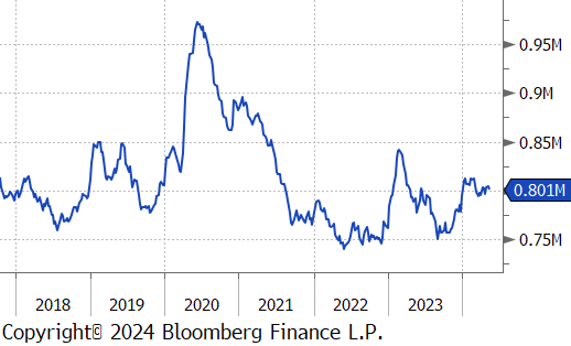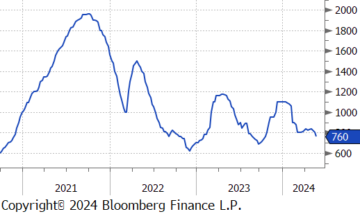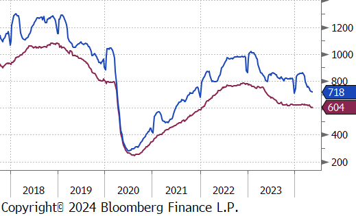 Finally, after last week’s surprising surge, initial jobless claims cooled, down to 222k, slightly above the expected 219k. This brings the 4-week moving average up to 218k, well below the threshold of 260k – the threshold we referenced last week as a level of distress.