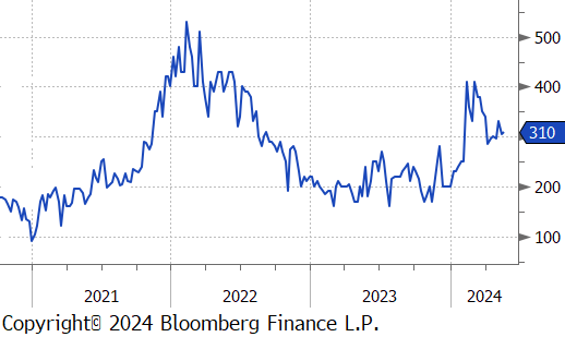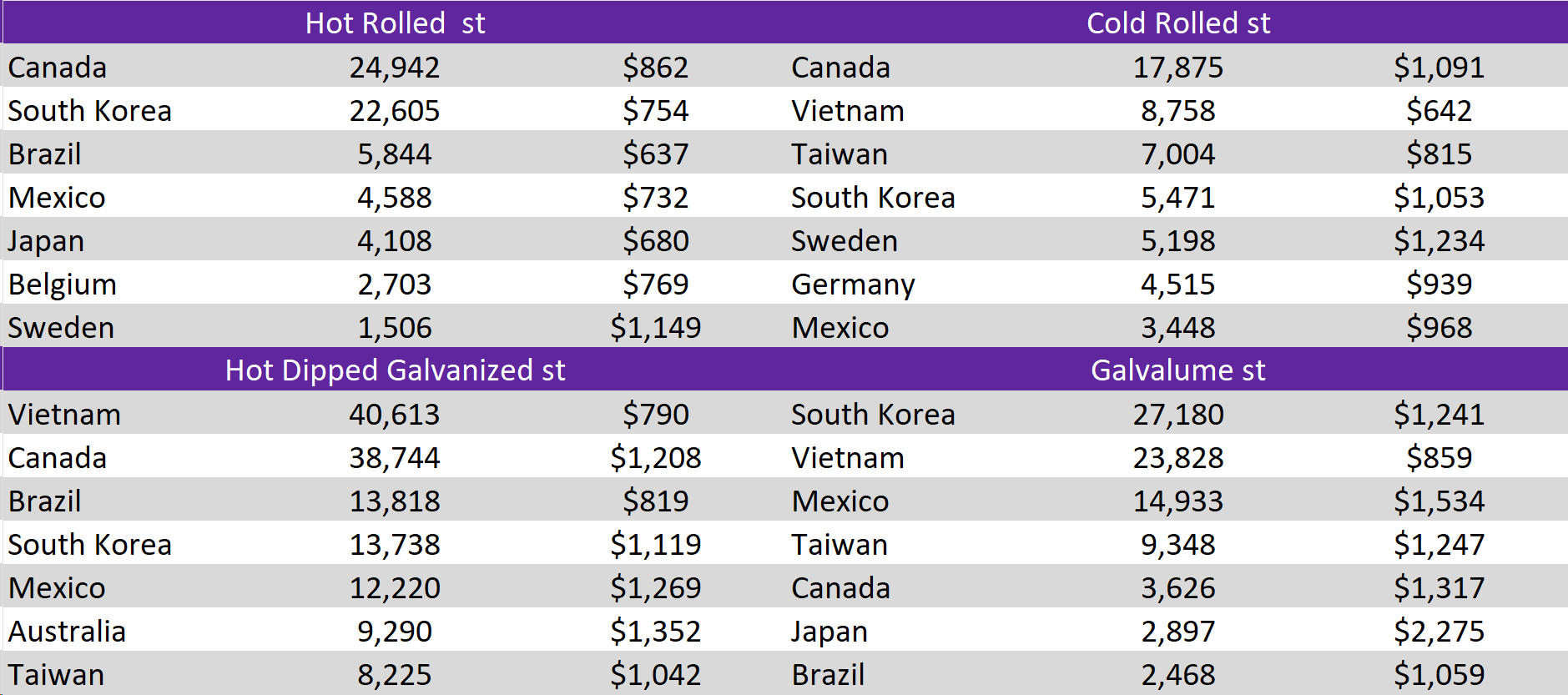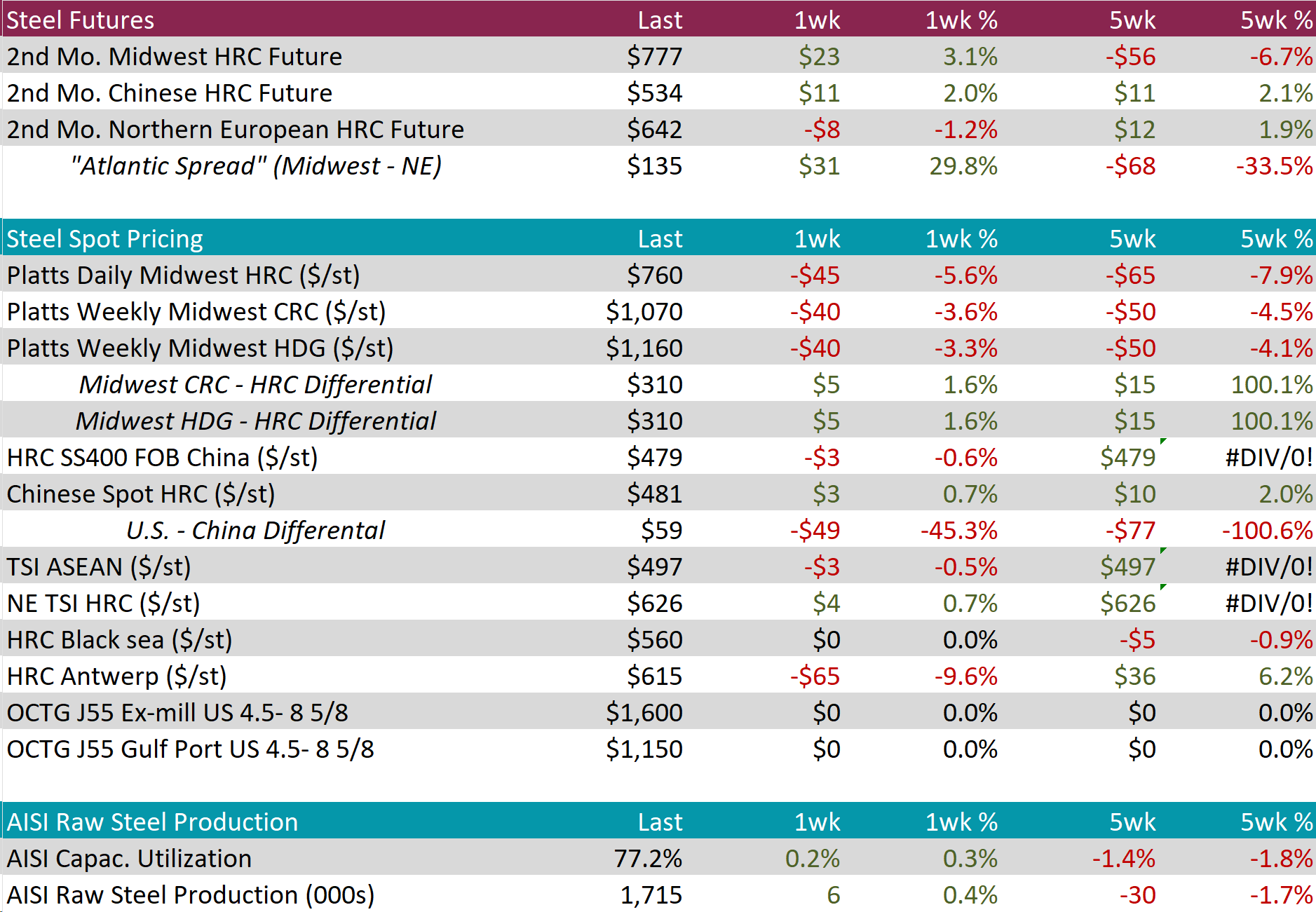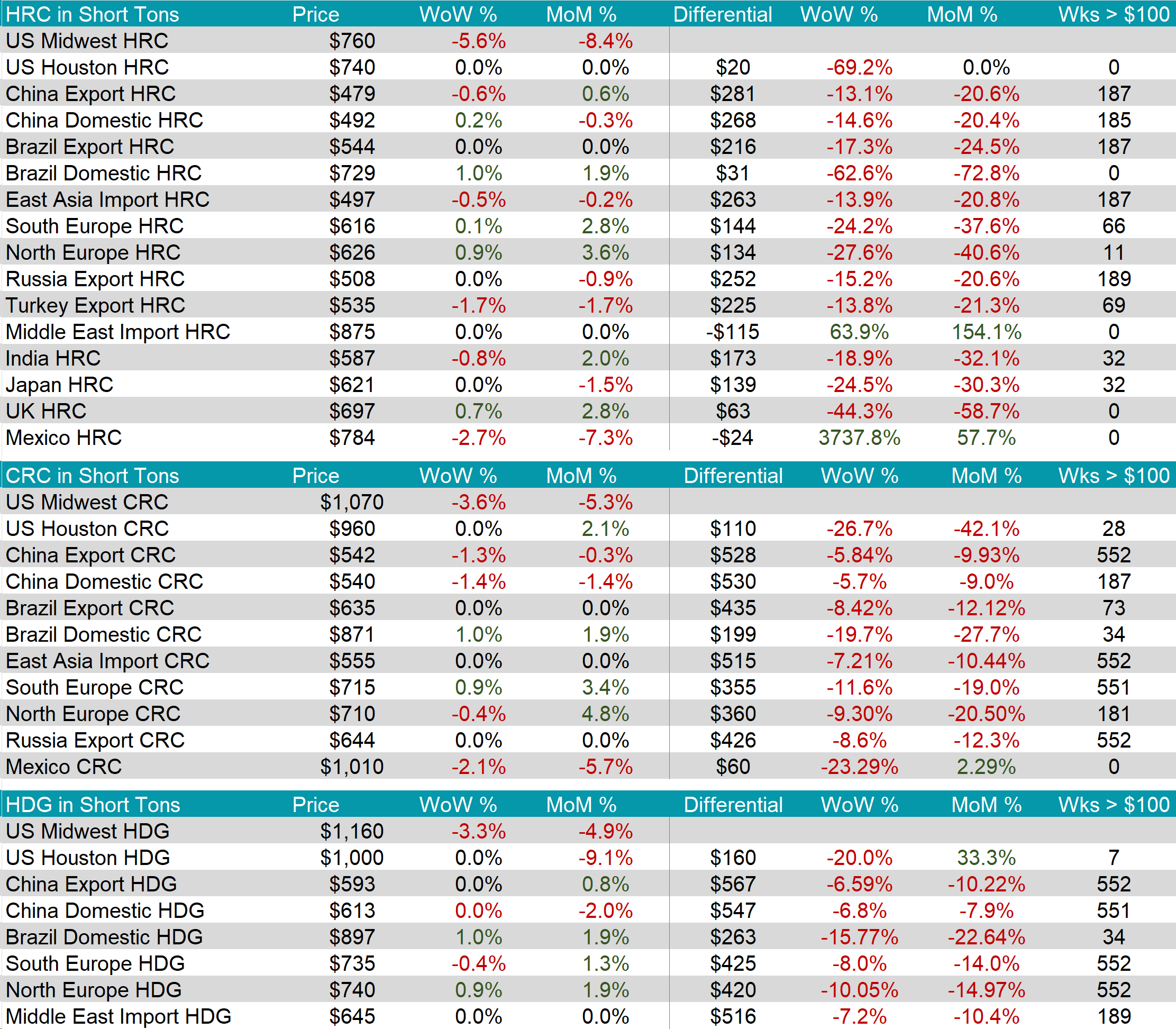 Tandem products both fell by $40, resulting in the HDG – HRC differential to rise by $5 or 1.6% to $310.