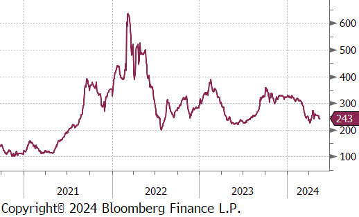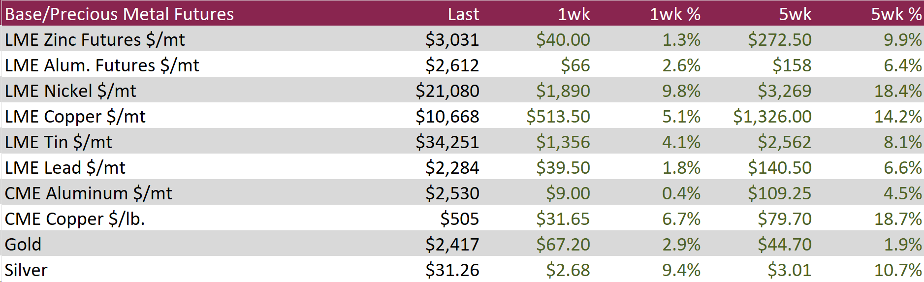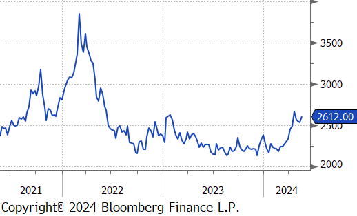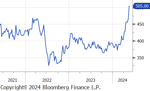 Copper continued to soar, reaching $509, amid strong demand expectations and concerns over tight supplies potentially leading to shortages. In response to a housing surplus and to prevent defaults among distressed developers, the Chinese government has decided to purchase unsold housing inventories. This measure complements an economic stimulus of 1 trillion CNY through long-term bond issuance this year, predominantly targeted at infrastructure projects. Such initiatives are expected to boost copper consumption, which is crucial for electrification projects including grid-scale energy storage and data center infrastructure. Meanwhile, limited copper availability is restricting output capabilities for Chinese smelters, who account for more than half of the global supply. With the high costs associated with launching new mining projects, major mining companies are opting for mergers and acquisitions over new ventures, highlighted by BHP’s renewed bid to acquire Anglo American.
