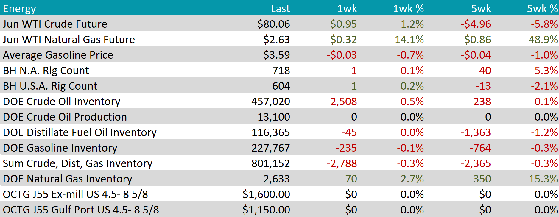 The Baker Hughes North American rig count had a slight reduction of 1 rig, bringing the total count to 718 rigs. At the same time, the US rig count grew by 1 rig, bringing the total count to 604 rigs.