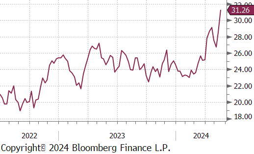 Silver increase by $2.68 or 9.4% to $31.26, marking their highest level since December 2012 and bringing year-to-date gains to nearly 33%. This surge is partly due to the bullish trend in the gold market, fueled by expectations that the Federal Reserve may begin cutting interest rates as soon as September. The precious metal’s status as a safe-haven asset has also been reinforced following the potential escalation of geopolitical tensions in the Middle East, sparked by the deaths of Iranian President Ebrahim Raisi and Foreign Minister Hossein Amirabdollahian in a helicopter crash. Additionally, silver’s demand is bolstered by its critical role in the production of solar panels, which are anticipated to reach record usage this year, likely leading the silver market into its fourth consecutive year of deficit.