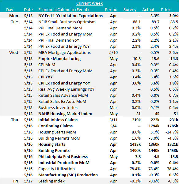 Early in the week, the NY FED 1yr inflation expectations consumer survey echoed the sentiment from the U of Michigan survey with a signal that there is less confidence in the disinflationary trend, with the reading increasing from 3% to 3.3% in April. Core PPI (ex. food & energy) also came in unchanged at 2.4%, above the expected 2.3% print. The Core CPI print calmed some of these nerves, coming line with the expected 3.6% print, marking the lowest core level since April 2021.