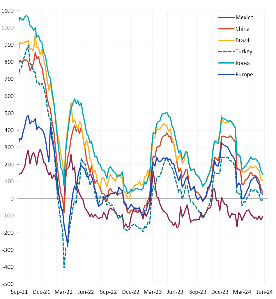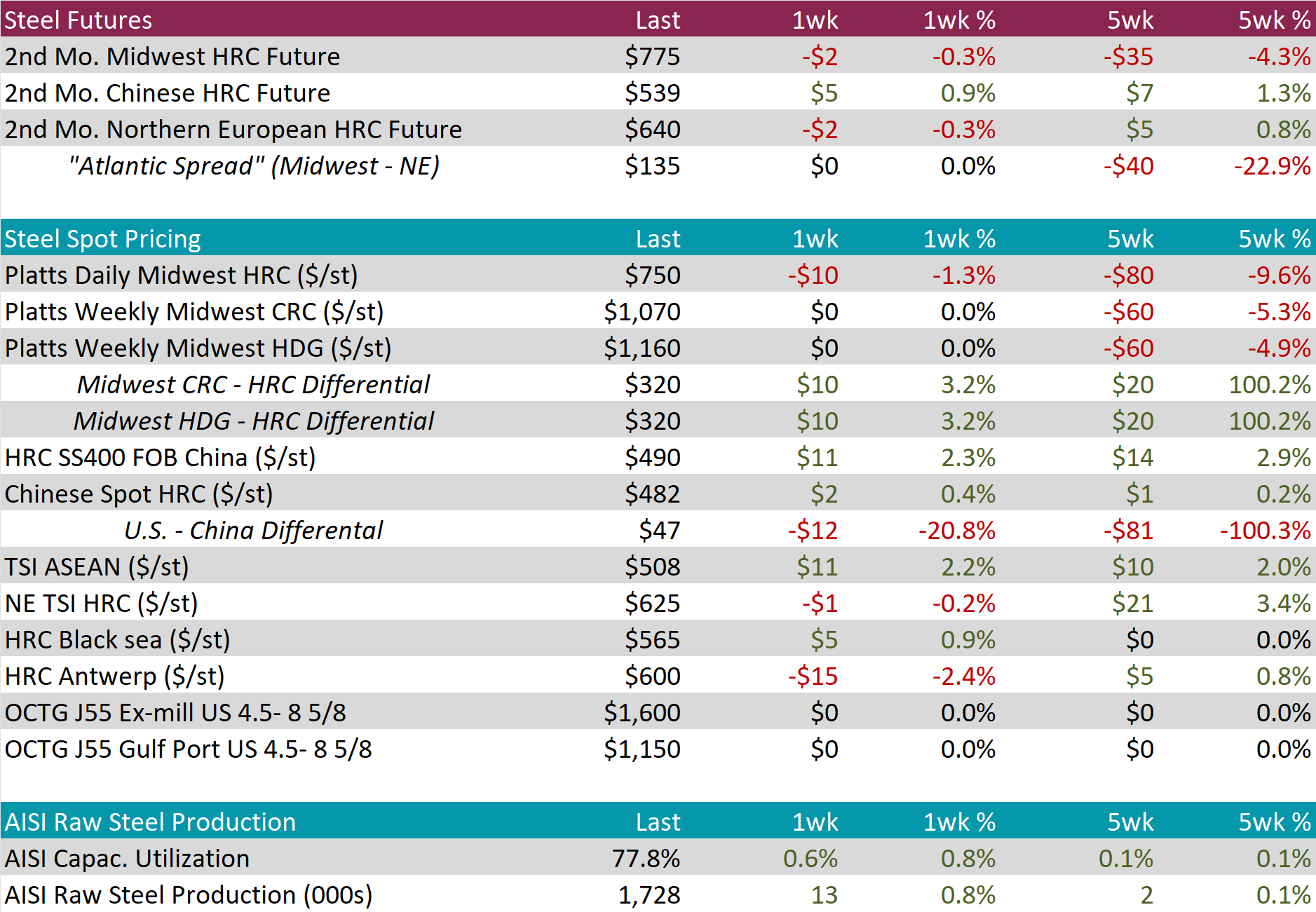 All watched global differentials contracted further. Most notable. Mexico HRC fell by -3.5% and the Houston HRC fell by -2.7%, while China Export HRC rose by 2.3%.