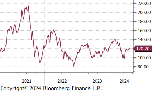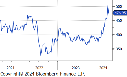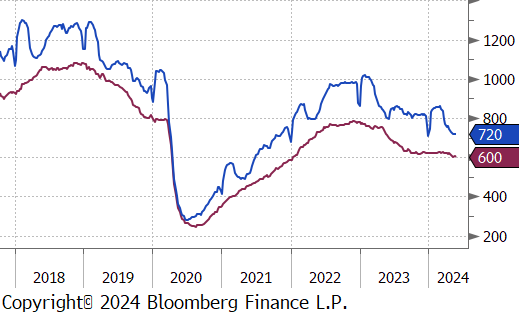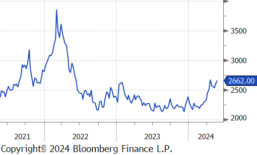 The 2nd month busheling future rose by $5 or 1.1% to $450, bringing the five-week price change to be down by $5 or -1.1%.