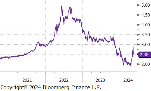 The Baltic Dry Index declined slightly by $48 or -2.6% to $1,796, further the decline from recent price high seen two weeks ago.