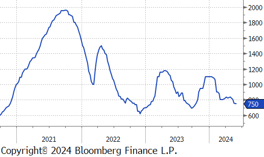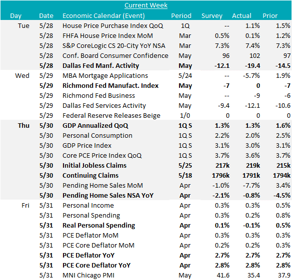 Pending home sales (NSA YoY) in April continued the recent trend of negative prints, but came in slightly better than expectations, down 0.8%. From the affordability side mortgage rates remain high and all this week’s measures of home prices continued to increase.
