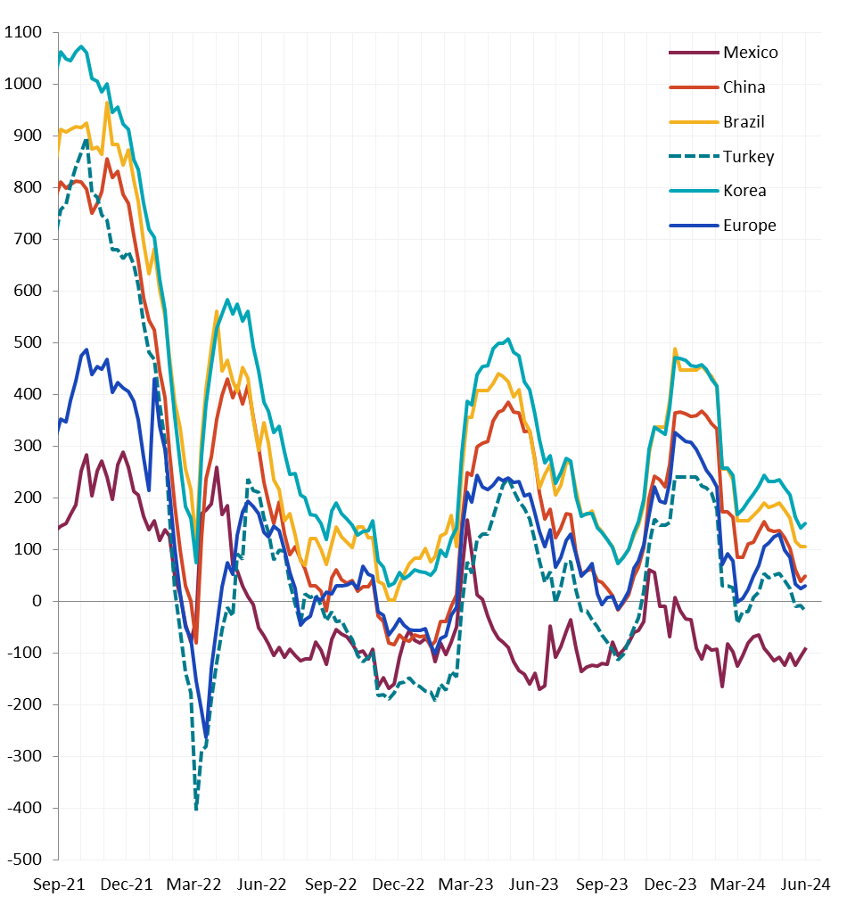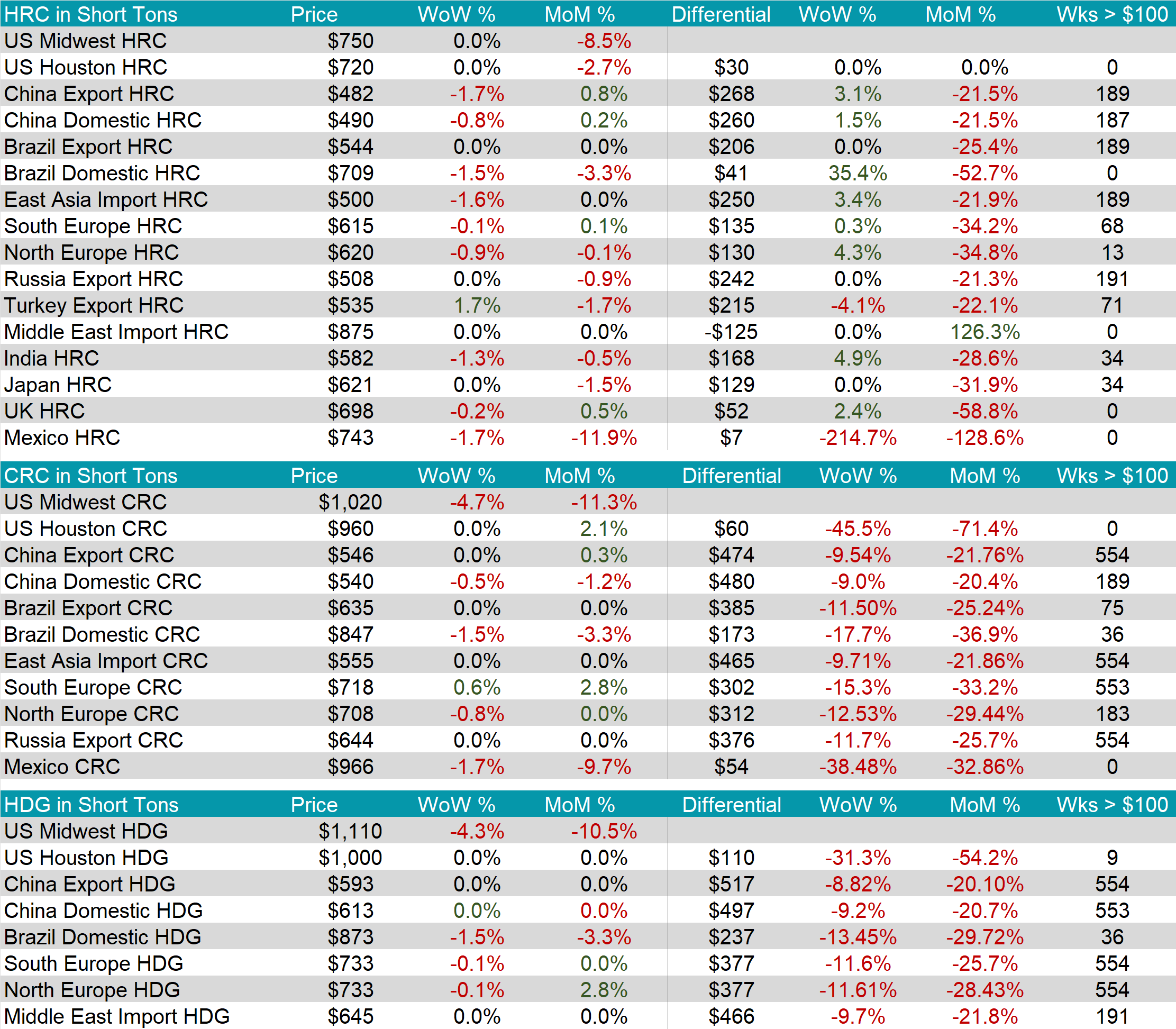 All watched global differentials expanded this week, except for Turkey’s and Mexico’s. Turkey’s Export HRC rose by 1.7%, while Mexico HRC fell by -1.7% and China Export HRC declined by -1.7%.