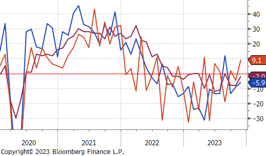 Moving to a more current set of releases, the first round of the November Fed Manufacturing Surveys were released, all 3 surprising to the upside. NY (Empire) surged into expansion territory at 9.1, the highest since April, gaining 14 points and well above expectations of a slight contraction of -3. In a similar fashion, Philadelphia rose to -5.9, above expectations of -8, and Kansas City rose to -2, well above expectations of a decrease to -9. While the latter two indexes remain in contraction territory, the summation of the moves (on the right) indicate an improving albeit restrained environment. While headwinds such as elevated interest rates and customers reporting elevated inventories, it is important to recognize that the worst of the cycle is likely in the rear-view mirror.