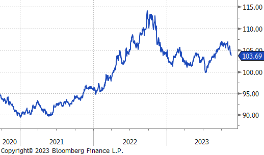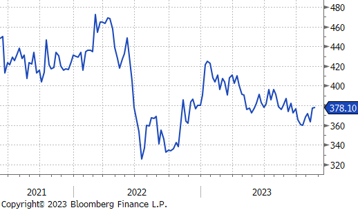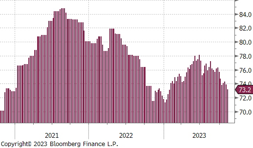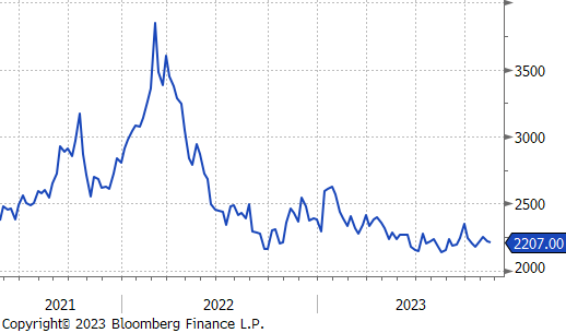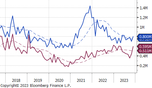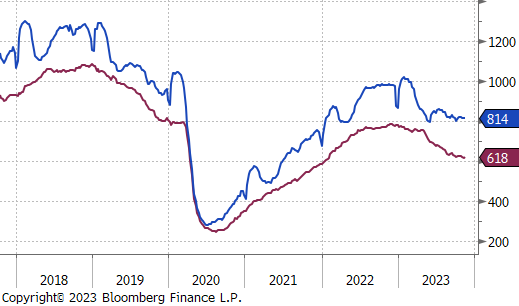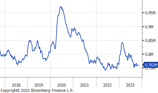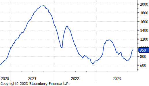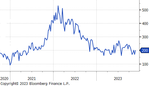Initial jobless claims jumped up to 231k, hitting the highest in nearly three-months, and well above market expectations of an increase to 220k from the prior reading of 217k. At the same time, continuing claims rose to 1865k, the highest in nearly two-years and sharply above expectations of a rise to 1847k from the prior reading of 1834k, indicating that those unemployed are starting to have a more difficult time finding suitable employment. This represents a clear indication that the labor market has more softening in the pipeline. Alarm bells around missing the soft landing will not start ringing unless the 3-week moving average pushes well above 260k for initial claims.
