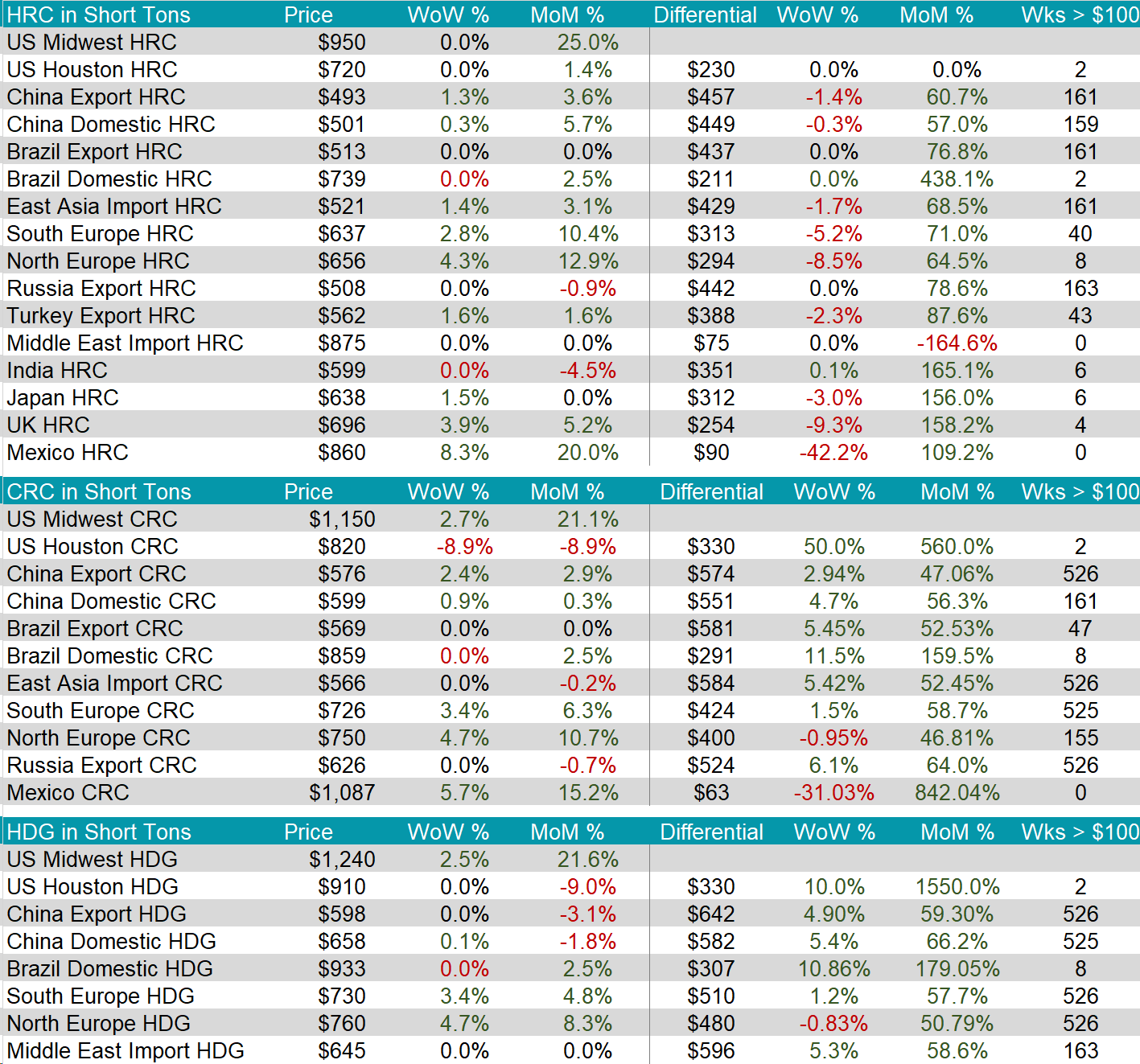 Tandem products both increased by $30, bringing the CRC up to $1,150 and HDG up to $1,240, resulting in the HDG – HRC differential increasing by $30, or 17.6%, to $200.