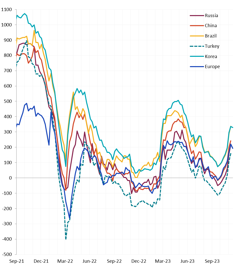 Global differentials were mixed with some remaining unchanged and others decreasing. Most notably, North Europe decreased by 8.5%, South Europe decreased by 5.2%, and China decreased by 1.4%.