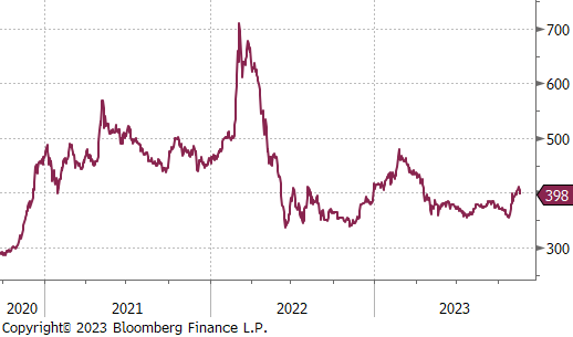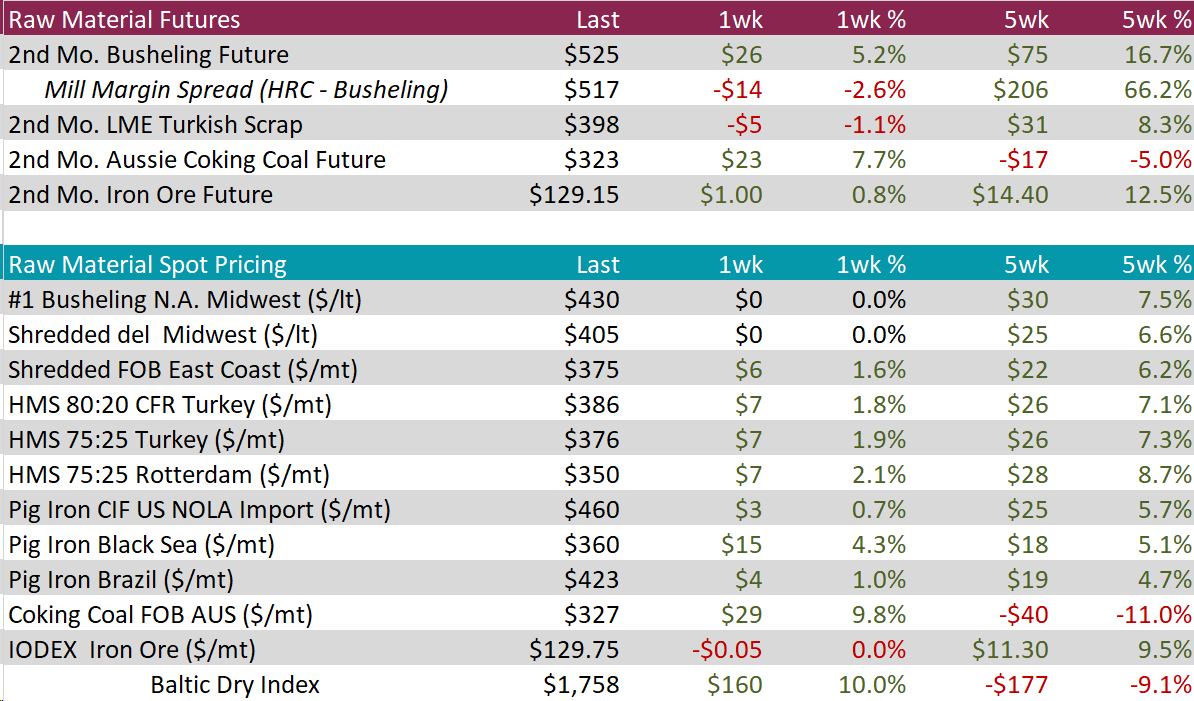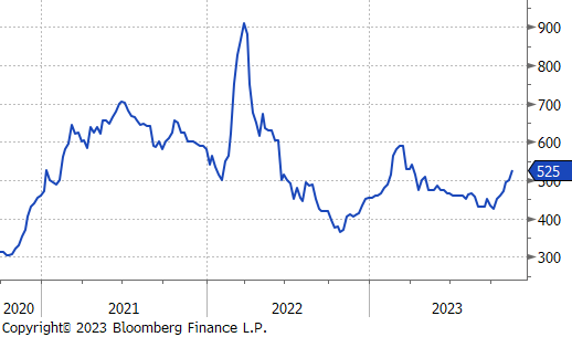 The 2nd month busheling future continued to increase, surging up by $26, or 5.2%, to $525, hitting the highest price seen since early April. Furthermore, since hitting the most recent low of $425 six-weeks ago, the price has rallied by $100.