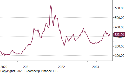 The 2nd month Aussie coking coal future continues to jump around, this time rising by $23, or 7.7%, to $323, after experiencing a decrease of $36 over two-weeks.
