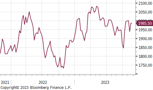 After gaining more than 2% last week, or $47, gold prices steadied at $1,985. This was supported by an easing in US inflation, which gave traders hope that the Fed’s tightening cycle is coming to an end, as they shifted their attention to possible interest rate cuts next year. The markets predict a 30% possibility that the Fed may start cutting rates as early as March 2024. For more direction, investors are currently awaiting the most recent FOMC minutes as well as a plethora of US economic data. As anticipated, the PBoC in Asia maintained its prime rates for one- and five-year loans at 3.45% and 4.2%, respectively.