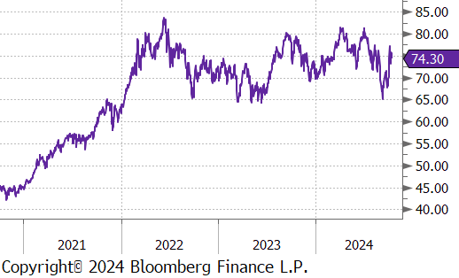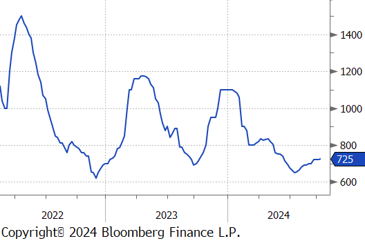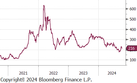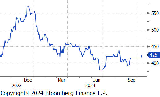 Copper futures decreased by $15.35 or -3.4% to $440 nearing the two-week low as weak economic signals from China weighed on demand expectations for the world’s largest copper consumer. In a briefing, China’s Ministry of Finance reiterated plans to issue more debt to support the struggling housing market, but the lack of specific figures left investors skeptical about the scale of the stimulus. Additionally, a slew of economic data added to concerns about China’s manufacturing sector. Chinese exports in September fell short of expectations, raising doubts about factories’ ability to compensate for weak domestic demand through foreign sales. Furthermore, new yuan loans and inflation figures also came in below forecasts. The continued stagnation of Chinese copper smelters’ processing fees, hovering near zero, further reflected the oversupplied market for refined copper, signaling poor demand.