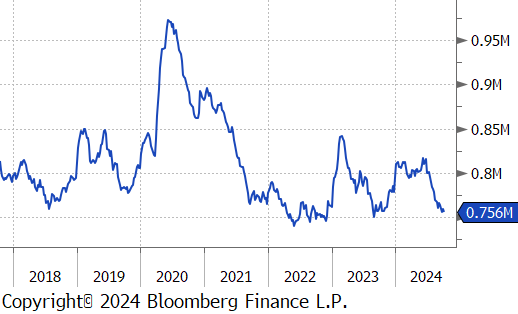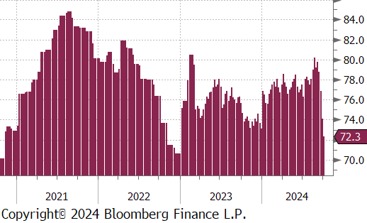 Mill production dropped further, with capacity utilization ticking down by -1.8% to 72.3%, bringing the raw steel production down to 1.606m net tons – the lowest level since December 2022.