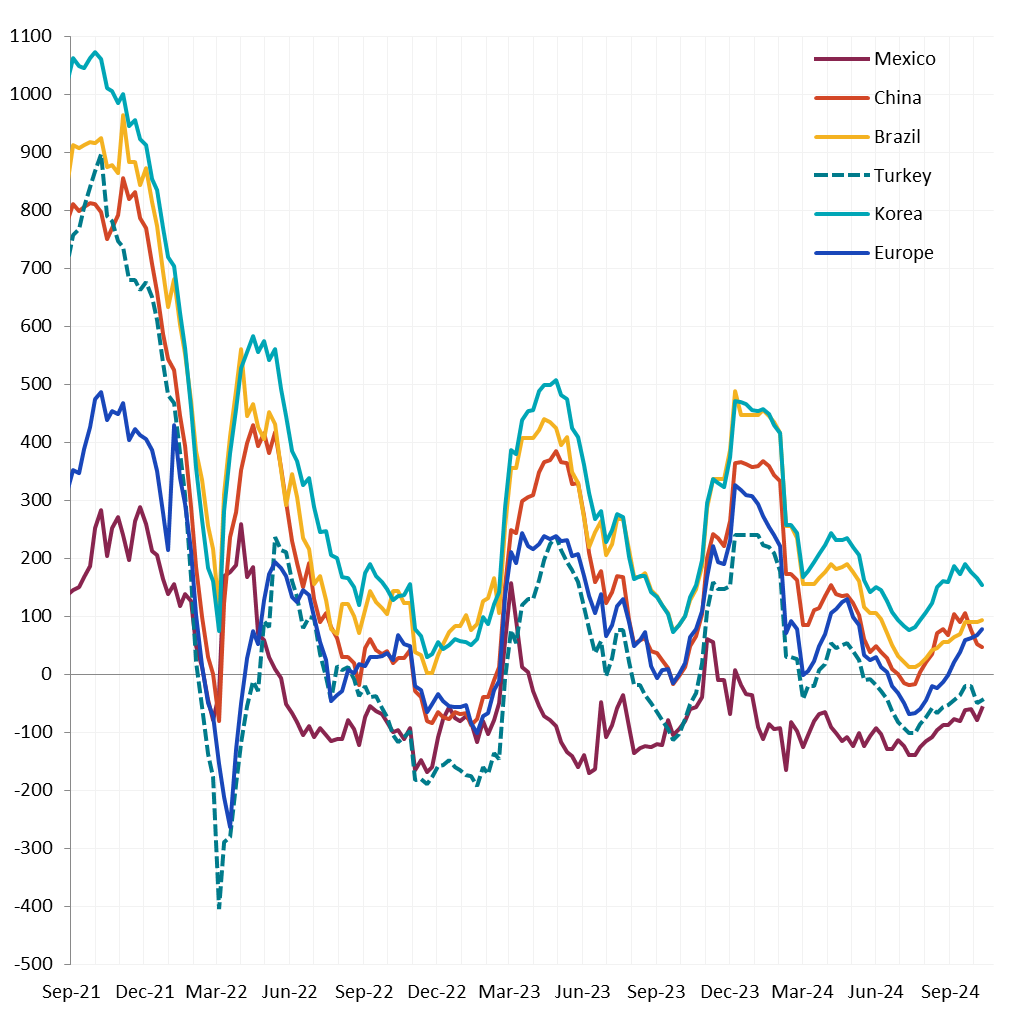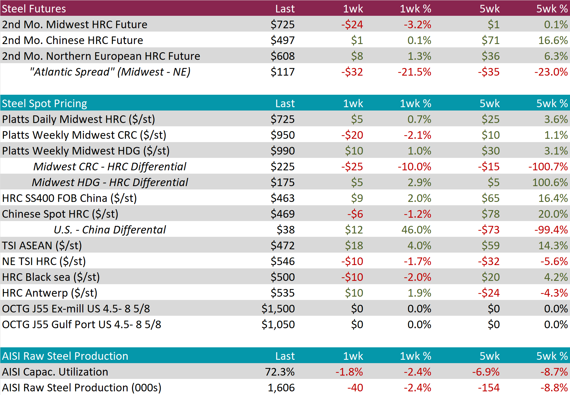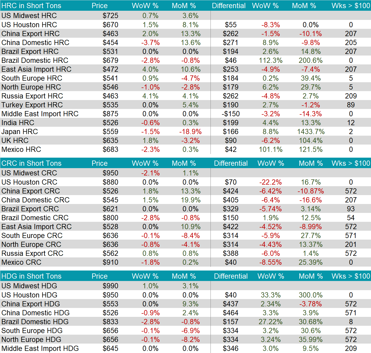 Watched global differentials were mixed this week, with China Export HRC rising by 2.0%, Korea HRC increasing by 4.0% and Russia Export HRC up by 4.1%, whereas N Europe fell by -1.0% and Mexico down by -2.3%.