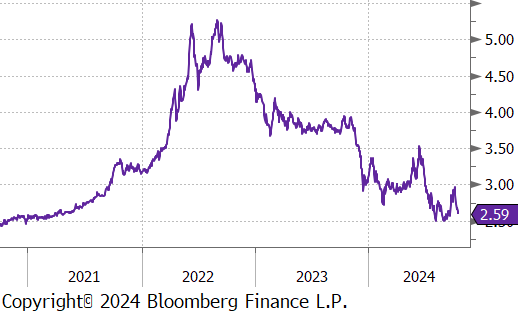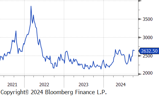 Aluminum futures declined by $88 or -3.3% to $2,541. This occurred as Emirates Global Aluminium (EGA) announced a suspension of bauxite exports from its operations in Guinea. This halt in bauxite, a key raw material for aluminum production, has led to concerns about supply disruptions, with alumina futures in Shanghai also rising to their highest levels since the contracts began in 2023. Although EGA’s alumina refinery in Abu Dhabi continues to operate normally, the broader market has been affected by supply constraints, including previous curtailments from Alcoa and Rio Tinto due to gas shortages and environmental inspections in China. The ongoing supply challenges are adding upward pressure on aluminum prices, with global demand, particularly from Chinese smelters, continuing to grow.