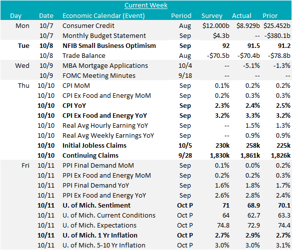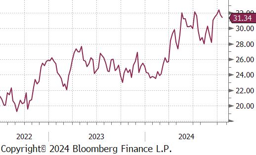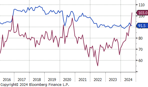 The NFIB Small Business Optimism index rose to 91.5 in Sept, a tick up from 91.2 but below the expected 92.0. This marks the 33rd consecutive month the index has remained below the 50-yr average of 98. Additionally, the Uncertainty Index surged to 103, the highest level on record. While the uncertainty component typically surges heading into a presidential election, the “record level” shows the compounded impact of elevated borrowing costs.