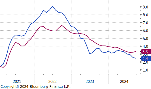 September’s MoM CPI and Core CPI both came in slightly elevated, up 0.2% vs 0.1% and 0.3% vs 0.2%, respectively. The YoY CPI Core which excludes food & energy rose for the second consecutive month, now up to 3.3% from August’s 3.1%. The clear overarching trend is that disinflation will continue, with current YoY levels 0.8% below where we were in Sept 2023 (4.1%). However, if recent stickiness in YoY price pressure proves to be more than a blip, will need to reevaluate the pace of the cutting cycle.