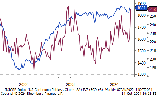 Finally, initial jobless (258k vs 230k) and continuing claims (1,861k vs 1,830k) both surged, providing a contradictory signal from the impressive payroll additions from the week prior. However, upon further inspection, this can be almost entirely explained away by Hurricane Helene and the ongoing strike from Boeing and thus the surprise does not signal a fundamental shift in the labor market. We anticipate these will be temporarily elevated (especially as the impact of Milton works through the labor market). From a policy perspective, the FOMC will likely look through the surge in claims and potentially lower than expected payrolls number at their next meeting.