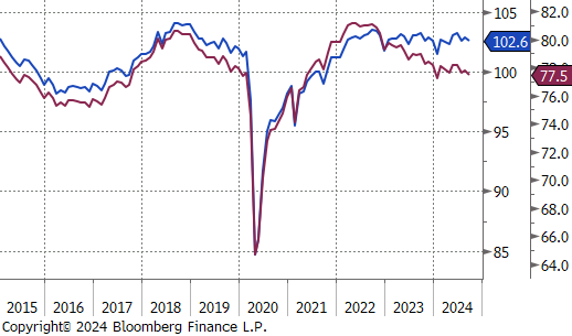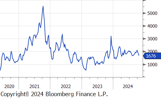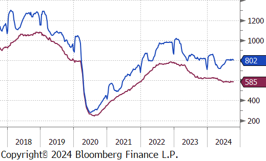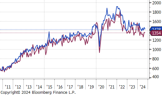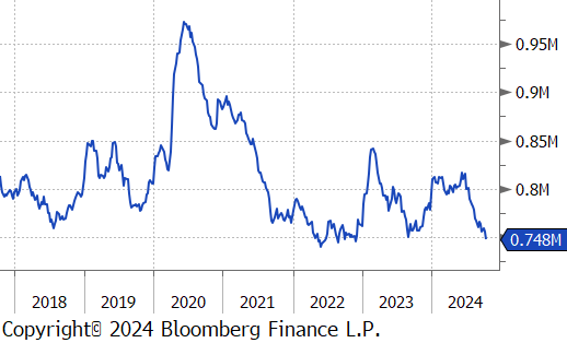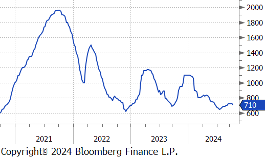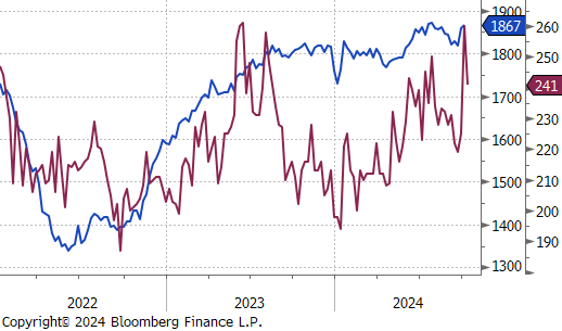 Interestingly, after last week’s worse than expected surge in initial jobless claims, this week’s figure came in well below expectations of another 259k claims, printing down to 241k. While this number could rise again next week, (the period surveyed encompasses the time between Hurricane’s Helene & Milton) it is an encouraging signal that the labor market is in fact more stable the last week’s surprise data initially suggested. Continuing jobless claims ticked higher to 1,867k from 1,861k.