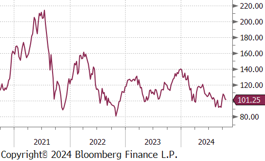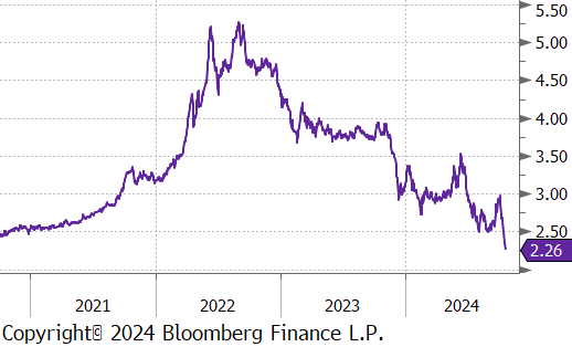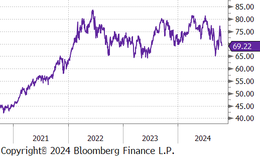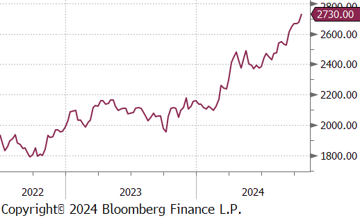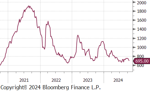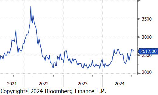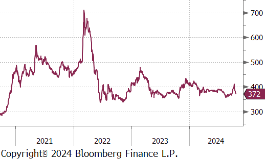 Copper futures fell by $7.45 or -1.7% to $433, as China’s central bank cut benchmark lending rates to record lows, improving the economic outlook for the world’s top copper consumer. The People’s Bank of China (PBOC) reduced the one-year loan prime rate by 25 basis points to 3.1% and the five-year rate to 3.6%. On Friday, the PBOC also took steps to support China’s equity market and hinted at further cuts to banks’ reserve requirements by year-end. Additionally, recent Chinese economic data exceeded expectations, further fueling optimism. Meanwhile, rising demand for copper, driven by the global shift toward cleaner energy, has heightened concerns of a supply shortfall as mining companies struggle to ramp up production.