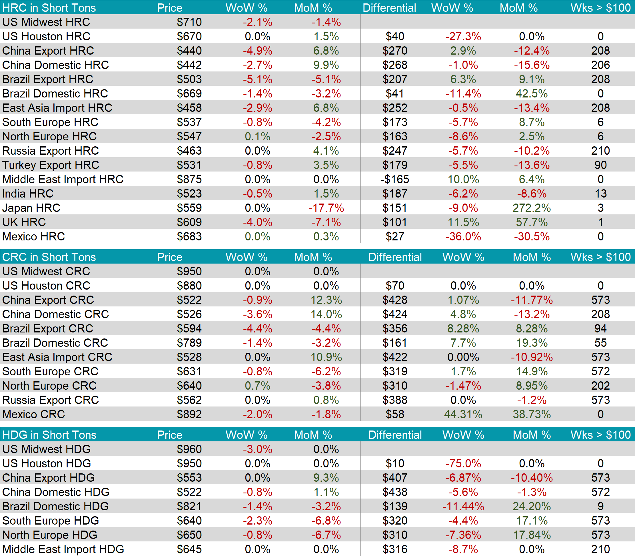 Watched global differentials were mixed this week, with China Export HRC dropping by -4.9%, Brazil Export HRC down by -5.1%, Turkey Export HRC falling by -0.8%, and N Europe HRC rising by 0.1%.