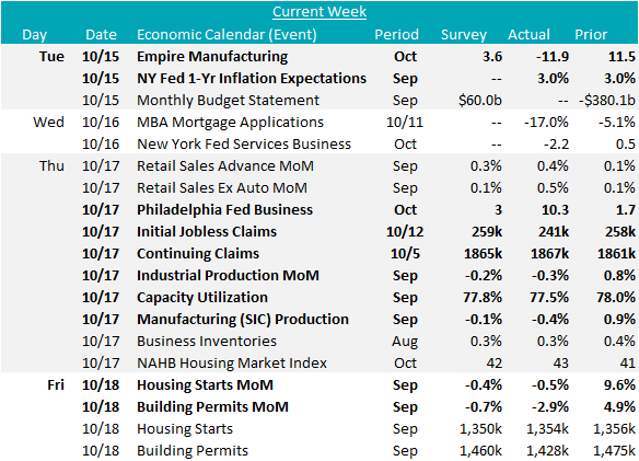 We also received the first round of October FED Manufacturing Surveys which provided vastly different pictures. Empire (NY) came in at -11.9, well below the expected 3.6, while Philadelphia printed up 10.3, well above expectations of a modest 3 increase.