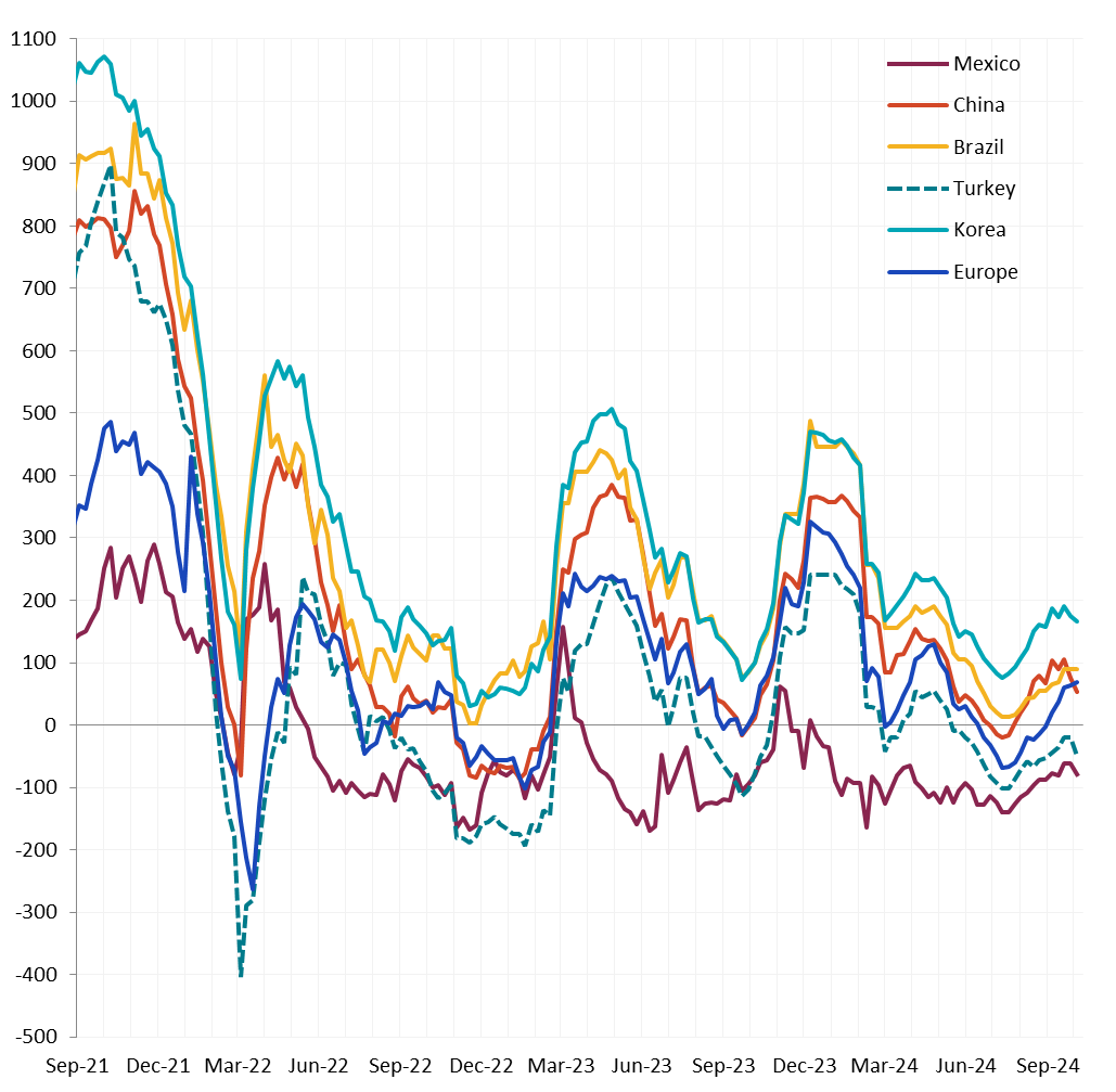 Watch global differentials were mixed this week, with China Export HRC surging by 4.2%, Korea HRC +2.0%, Turkey HRC +4.4% and Mexico HRC +2.7%, whereas North Europe HRC continued to slip, -1.0%.
