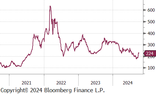 The Aussie coking coal 2nd month future rose by $8 or 3.7% to $225, marking the fourth consecutive week of price increases and the highest price in nine weeks.