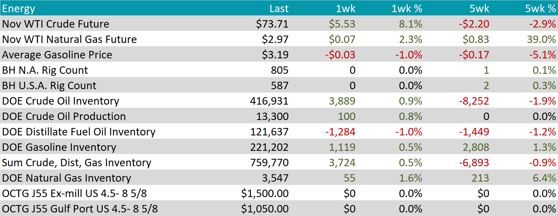 • Crude oil and natural gas futures made gains as the aggregate inventory level rose for the first time in three weeks, and the NA rig count held steady.