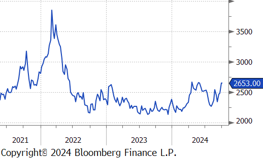 Aluminum futures fell by $18 or -0.7% to $2,629, easing from the four-month high of $2,685 reached on October 2nd. This pullback comes as markets assess the potential impact of recent economic support measures from the Chinese government on industrial demand. Following an economic-focused Politburo meeting, Beijing announced an aggressive fiscal stimulus package aimed at helping the economy reach its 5% growth target for the year. This follows the People’s Bank of China’s (PBoC) earlier monetary stimulus, which included key rate cuts, injecting CNY 1 trillion of liquidity, and refinancing over CNY 37 trillion in mortgages at more favorable rates. Additionally, ongoing risks around alumina supply in China, exacerbated by earlier output disruptions in Guinea and Australia, continue to support aluminum prices.