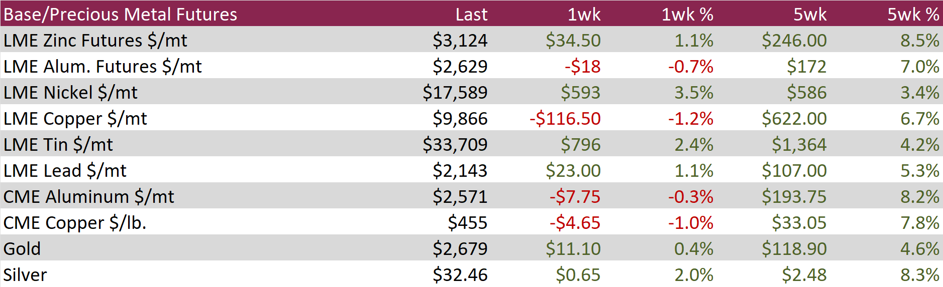 • Base metals were mixed this week, with aluminum and copper easing, whereas precious metals increased, with silver hitting its highest price in 12 years.