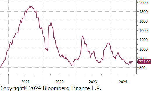 The HRC spot price increased by $10 or 1.4% to $700, breaking back into the $700 price level for the first time since mid-June. At the same time, the HRC 2nd month future fell by $14 or -1.9% to $724, declining for the first time in three weeks.