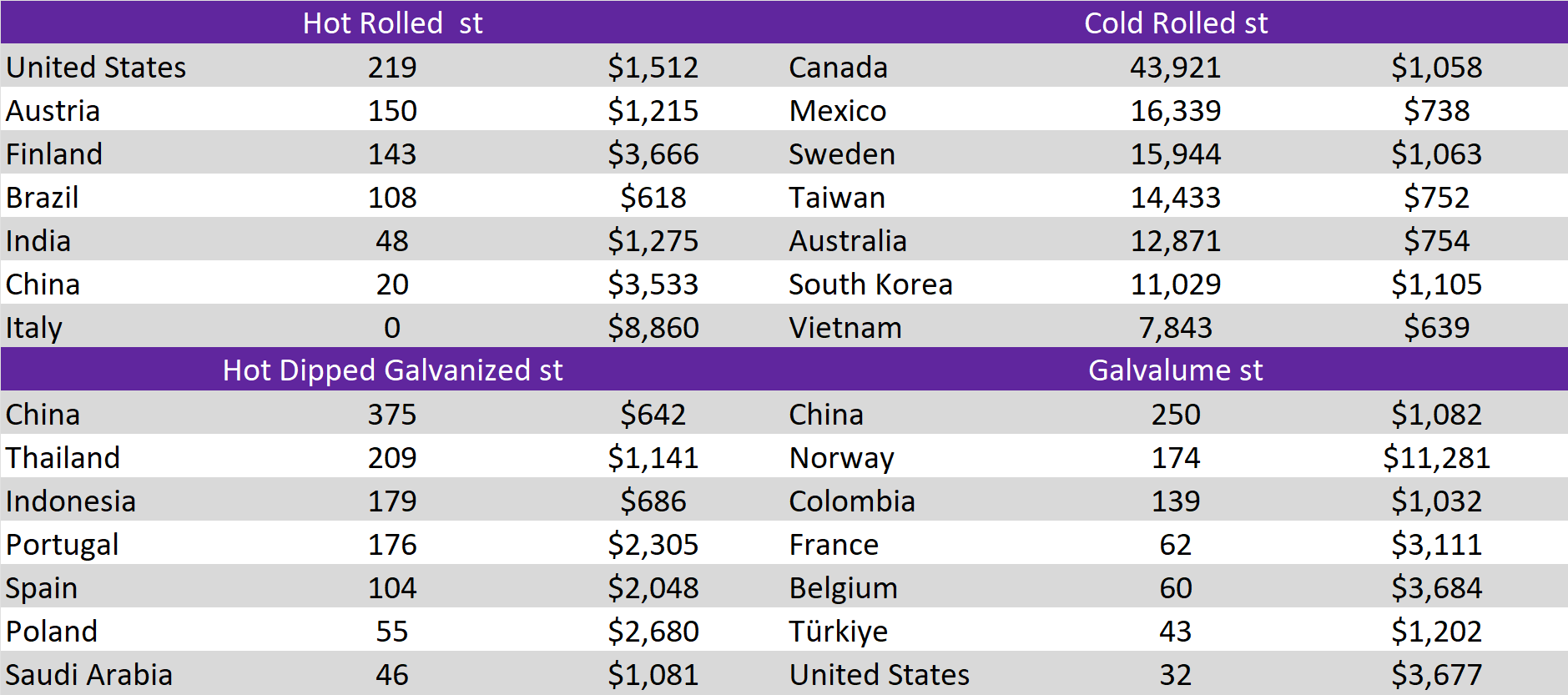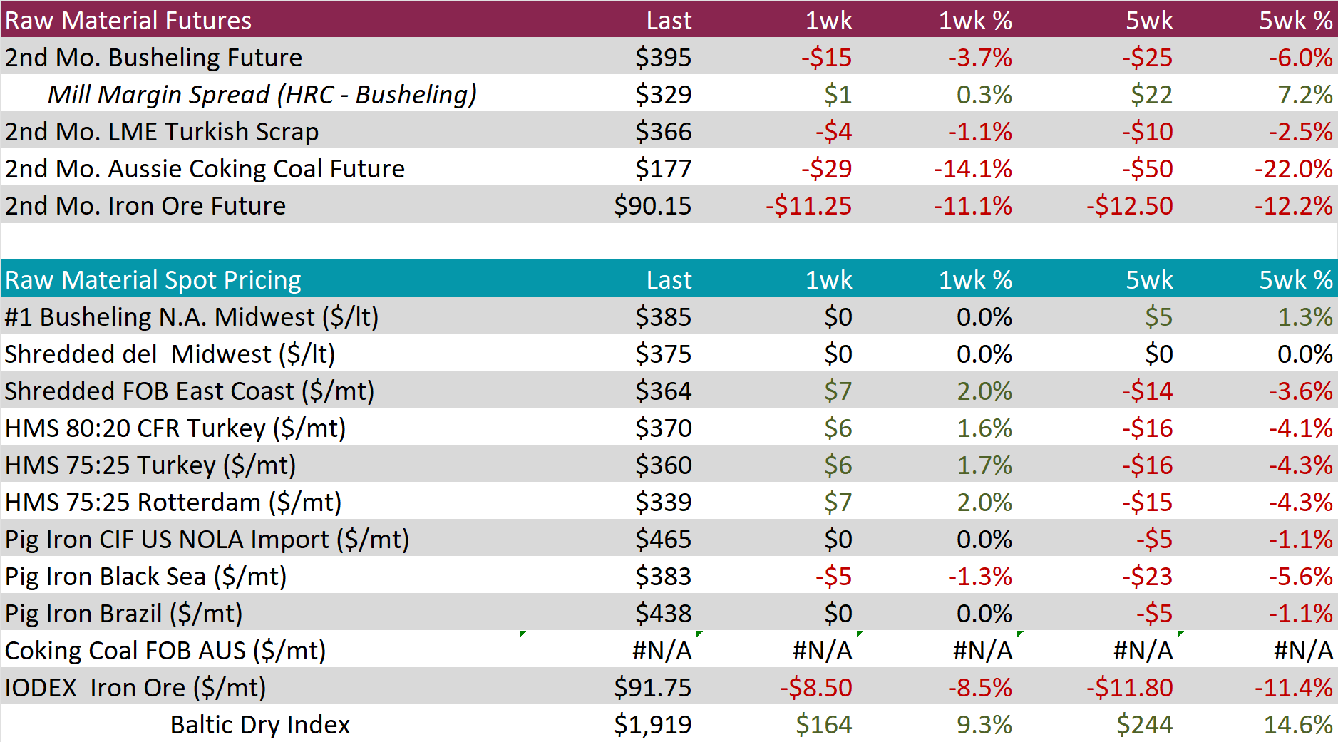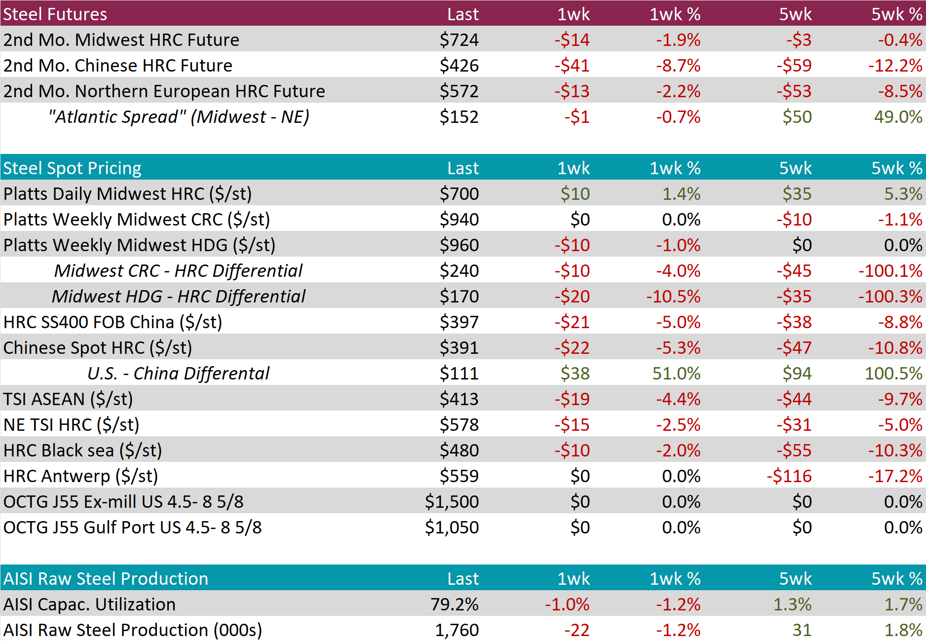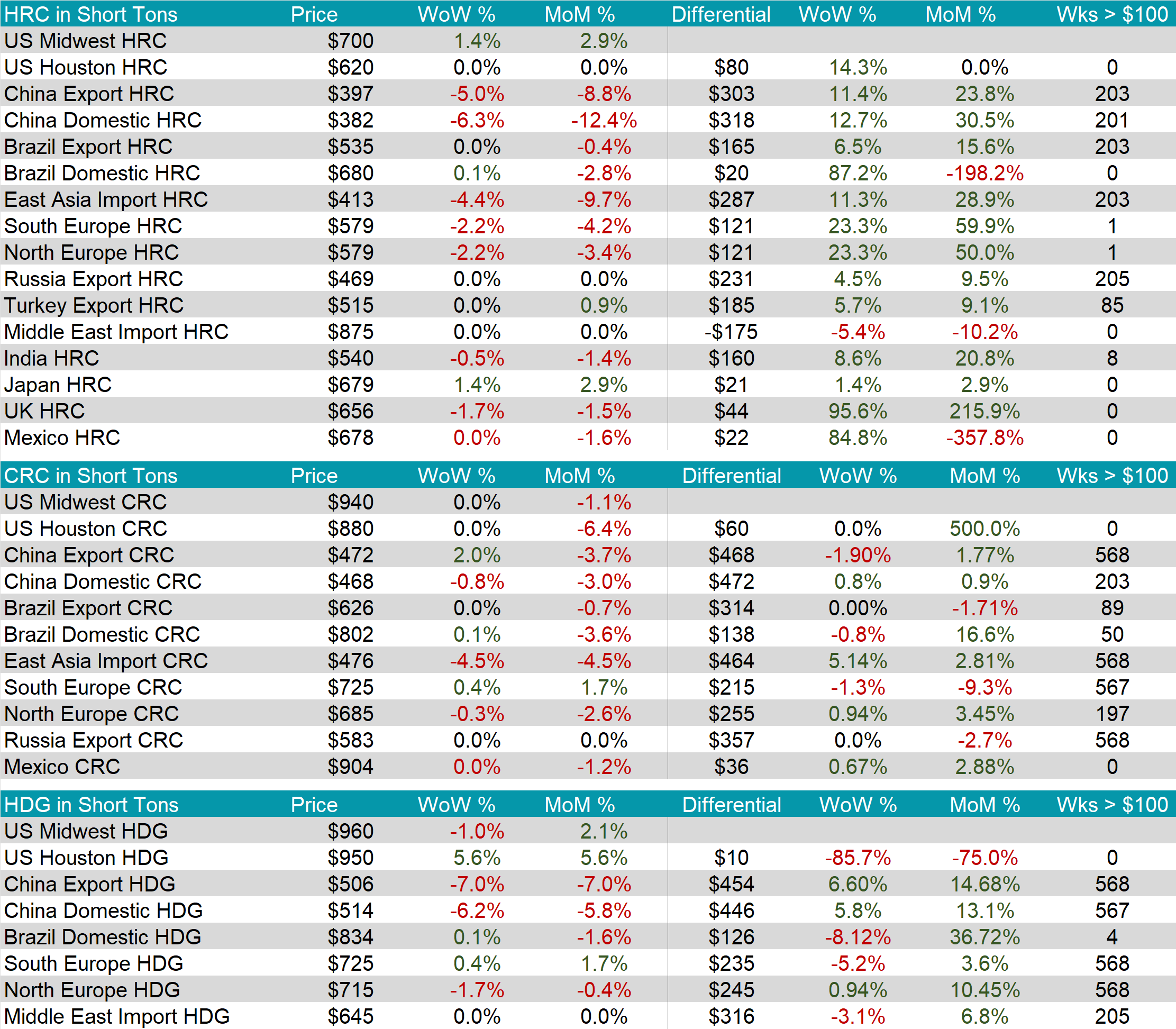 Tandem products were mixed, with CRC remaining unchanged whereas HDG dipped by $10, resulting in the HDG – HRC differential to decrease by $20 or -10.5% to $170.