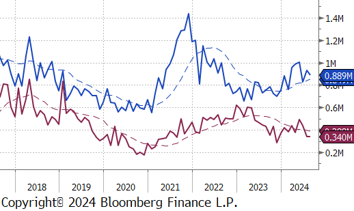 Friday’s jobs data did not provide conclusive evidence in either direction for whether the upcoming September interest rate cut should be 25bps or 50. Nonfarm Payrolls printed up to 142k but came in below expectations of 165k and prior two-month revisions pulled last months negative surprise even lower, from 114k to 89k. That said, it is important to remember that the labor market cooling is by design to stamp out inflation and the 6-month moving average remains at 142k, which is historically elevated. On the other hand, the Unemployment Rate ticked lower to 4.2% from 4.3%.