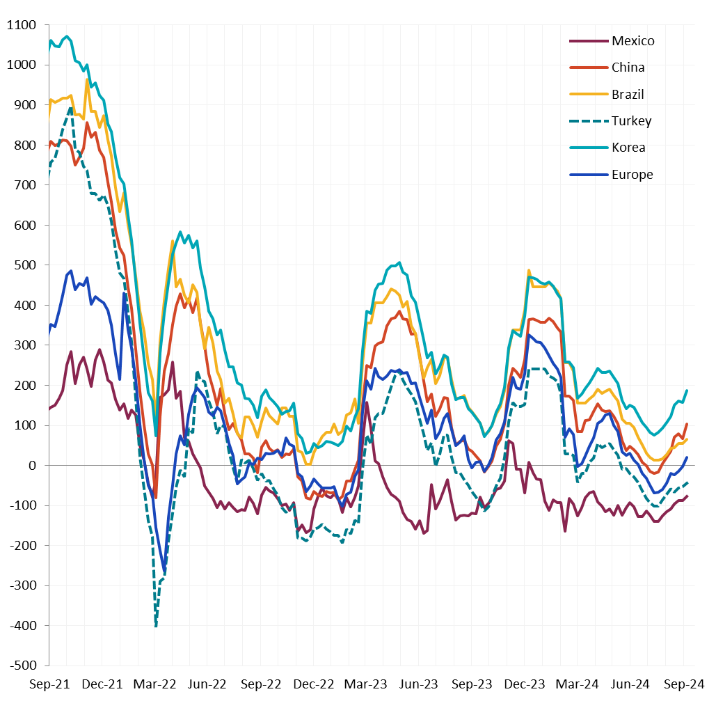 All watched global differentials expanded, with China Export HRC falling by -5.0%, Korea dropping by -4.4%, and North Europe HRC down by -2.2%.