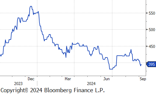 Copper futures fell by $14.90 or -3.5% to $407. This downturn was triggered by disappointing U.S. manufacturing and labor market data, which reignited fears of a recession. Such fears tend to dampen the demand outlook for industrial materials like copper. Adding to the negative sentiment, analysts noted declining demand in China, the world’s largest consumer of commodities. The Australian mining giant BHP Group has recently lowered its forecast for China’s copper demand, citing concerns about the country’s economic recovery. On a more positive note, expectations that the US Federal Reserve might begin cutting interest rates this month have offered some support to commodity prices. Market participants are now focused on upcoming US inflation data, which could determine the magnitude of the Fed’s anticipated rate cut.