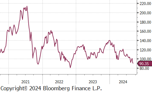 The iron ore 2nd month future decreased by $11.25 or -11.1% to $90.15, sinking to its lowest level since November 2022.