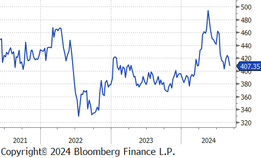 The 2nd month busheling future declined by $15 or -3.7% to $395, falling below the $400 price level for the first time since early July.
