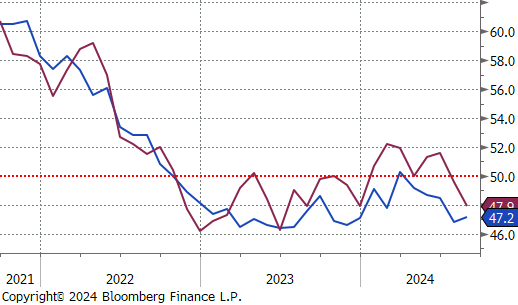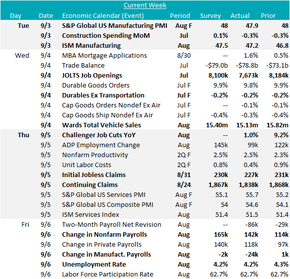 The August ISM Manufacturing PMI rose to 47.2, from 46.8 but came in below expectations of a 47.5 print. This is the 21st of the last 22 readings where the ISM Manufacturing PMI has been in contractionary territory. Additionally, the final S&P Global Manufacturing PMI ticked down to 47.9, from a preliminary estimate at 48, the second month of contraction.