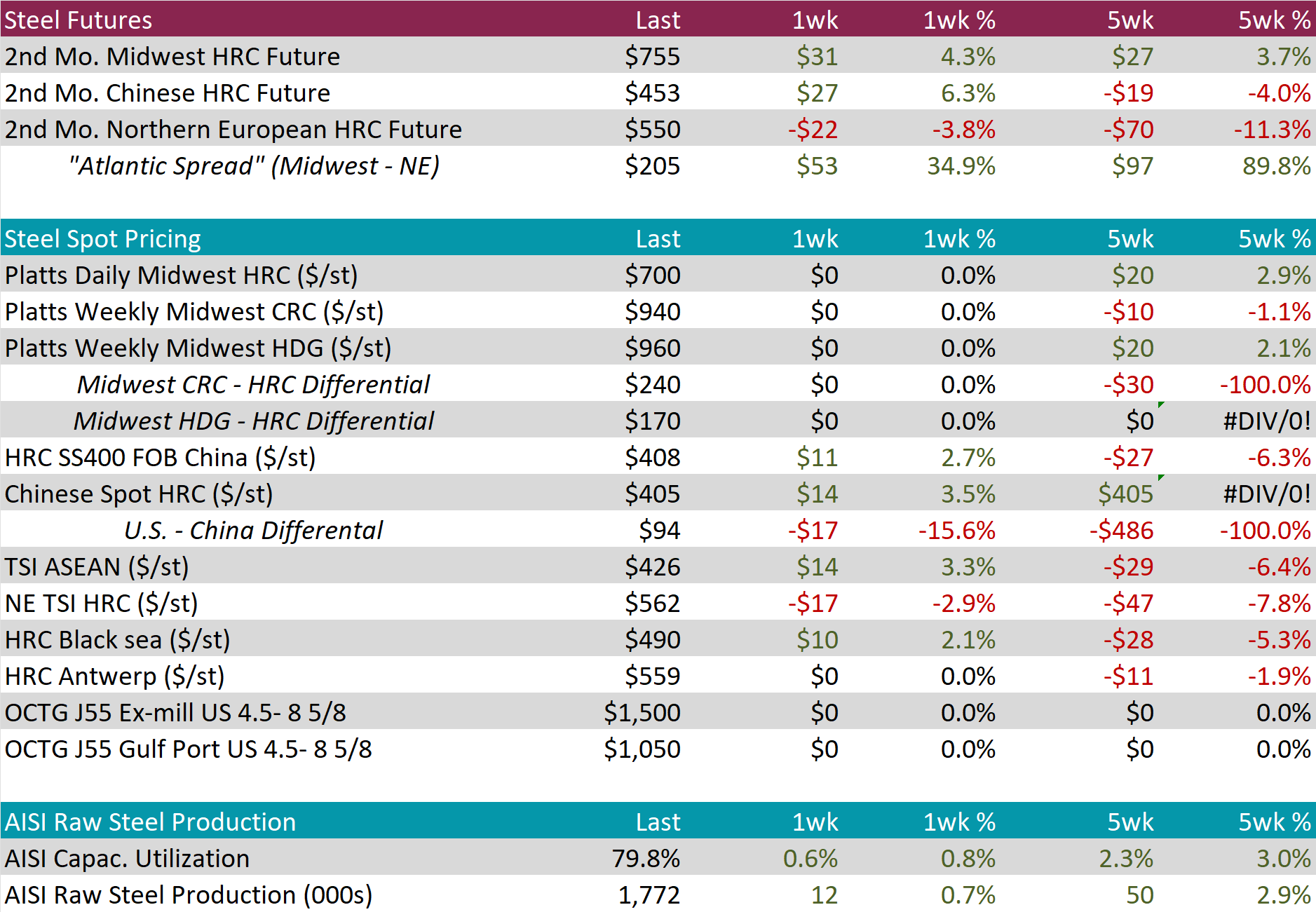 The HRC spot price held steady week-over-week at $700. At the same time, the HRC 2nd month future rose by $31 or 4.3% to $755, reaching the highest price since May.