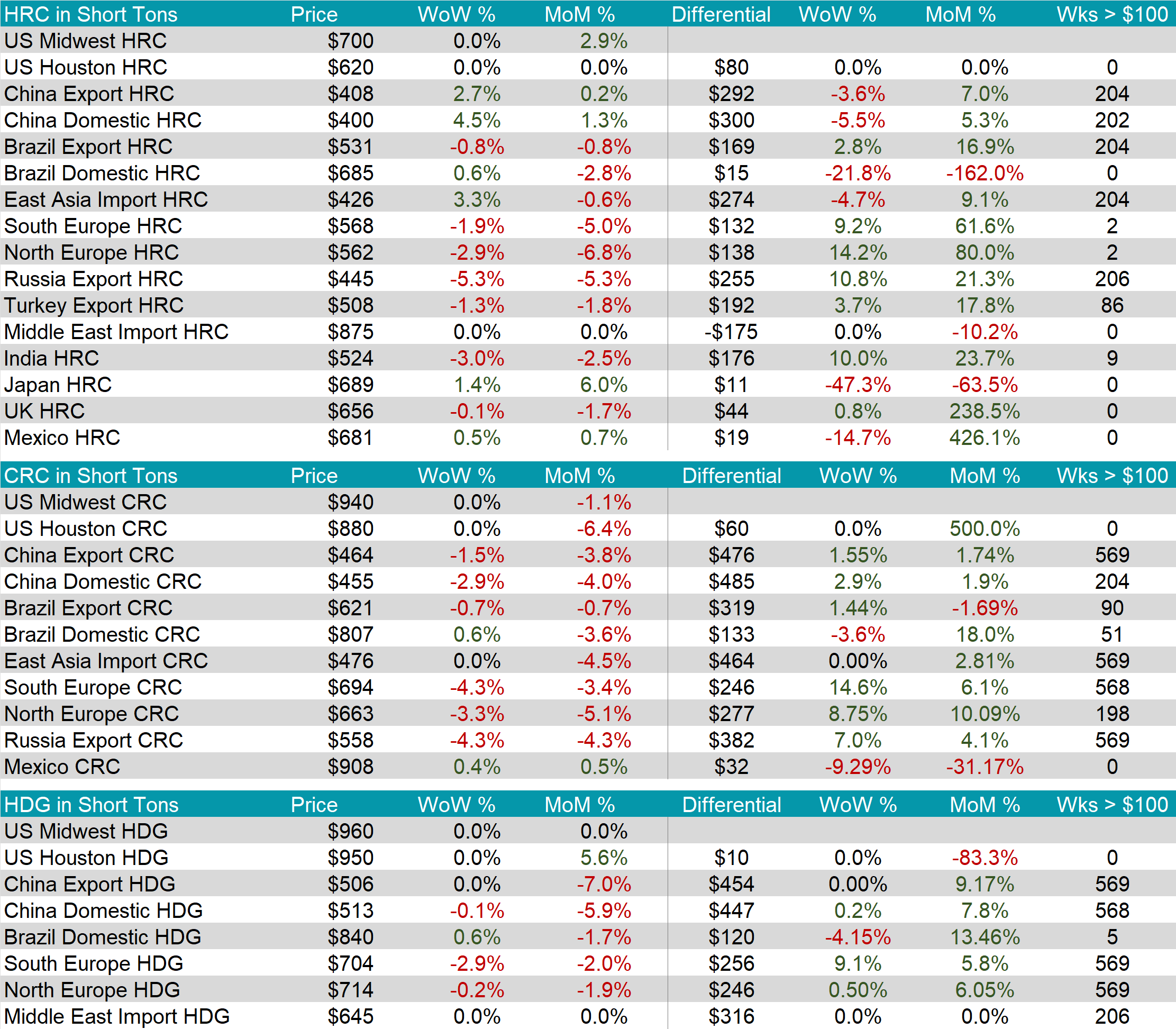 Watched global differentials varied this week, with China Export HRC increasing by 2.7% and Korea’s HRC price rising by 3.3%, while Russia Export HRC dropped by -5.3% and N Europe fell by -2.9%.